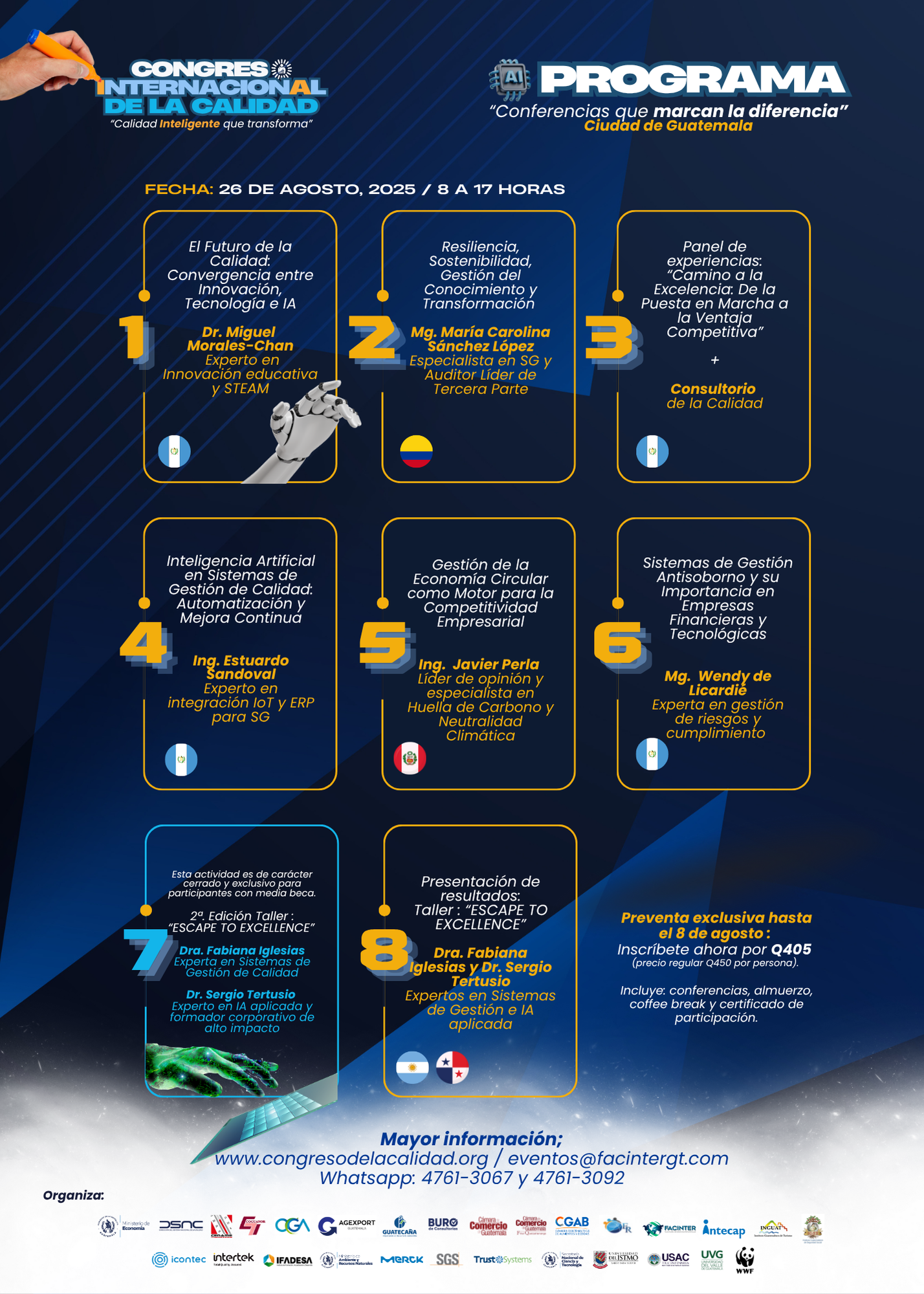 Descubre a los referentes que guiarán cada sesión de nuestro programa de conferencias: especialistas con amplia trayectoria en gestión de la calidad, innovación tecnológica, sostenibilidad y transformación organizacional. Cada uno de ellos aportará experiencias y herramientas prácticas y visión de futuro para impulsar el desempeño profesional.